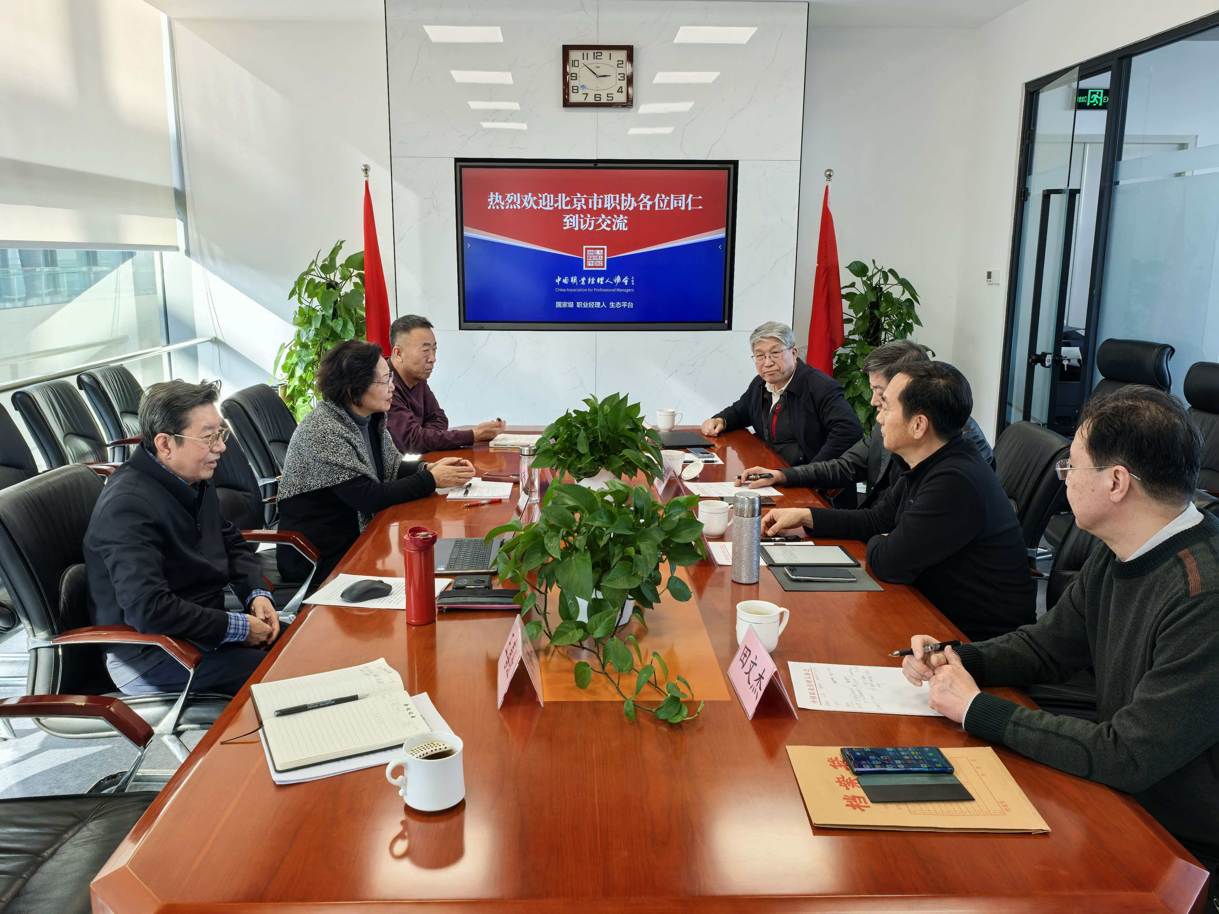 北京市职业经理人协会会长刘颖悟、常务副会长侯学东、秘书长田文杰、首席顾问王国强一行,莅临中国职业经理人协会交流。